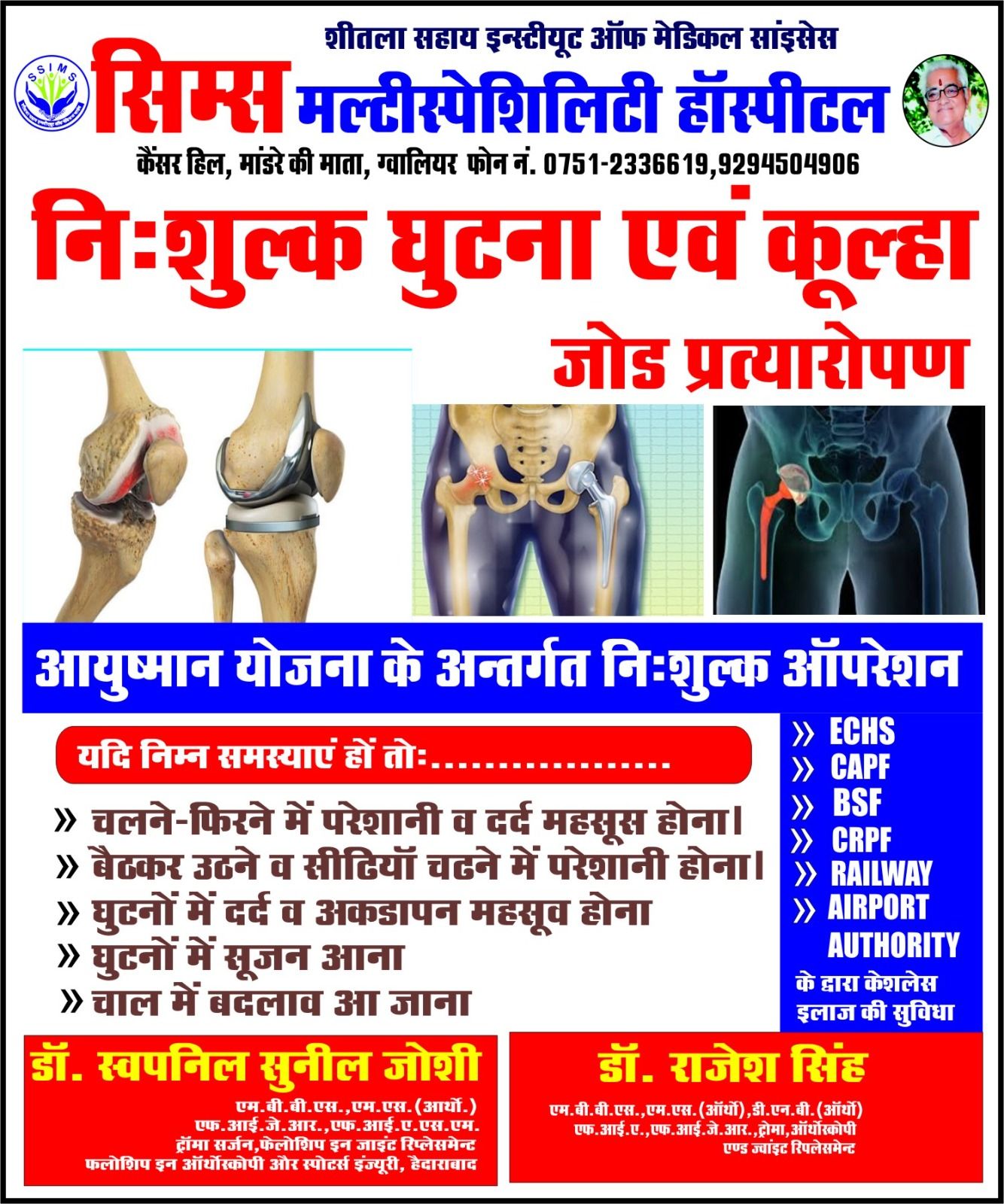 सिम्स हॉस्पीटल ग्वालियर मध्यप्रदेश मो-7566659171 आयुष्मान एवं अन्य सरकारी योजना के अंतर्गत निःशुल्क इलाज उपलब्ध है. अधिक जानकारी हेतु दिए हुए नम्बर पर संपर्क करें -7566659171