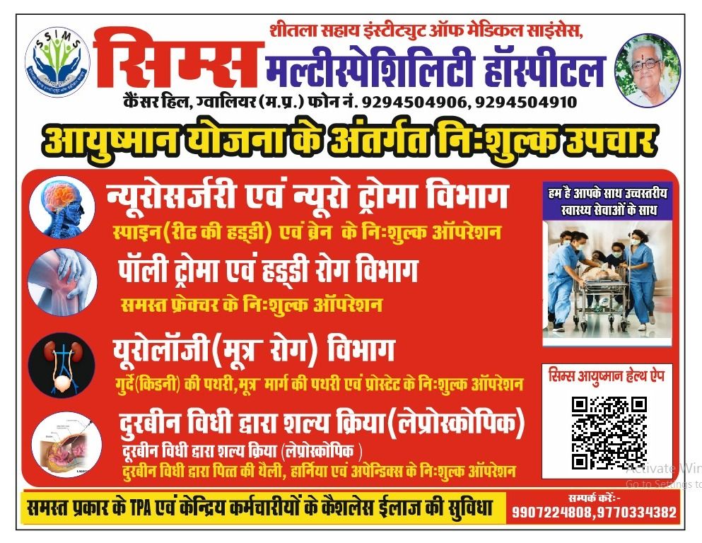 सिम्स हॉस्पीटल ग्वालियर मध्यप्रदेश मो-7566659171 आयुष्मान एवं अन्य सरकारी योजना के अंतर्गत निःशुल्क इलाज उपलब्ध है. अधिक जानकारी हेतु दिए हुए नम्बर पर संपर्क करें -7566659171