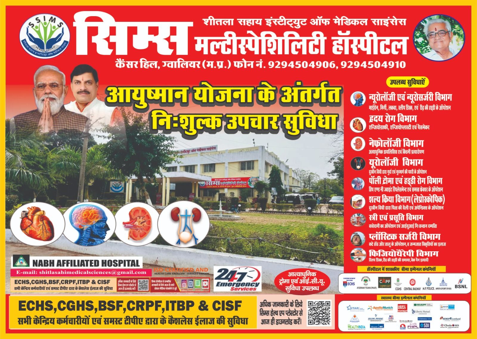 सिम्स मल्टीस्पेशलिटी हॉस्पीटल ग्वालियर मध्यप्रदेश आयुष्मान एवं अन्य सरकारी योजना के अंतर्गत निःशुल्क इलाज उपलब्ध है अधिक जानकारी हेतु संपर्क करें मो. 7566659171